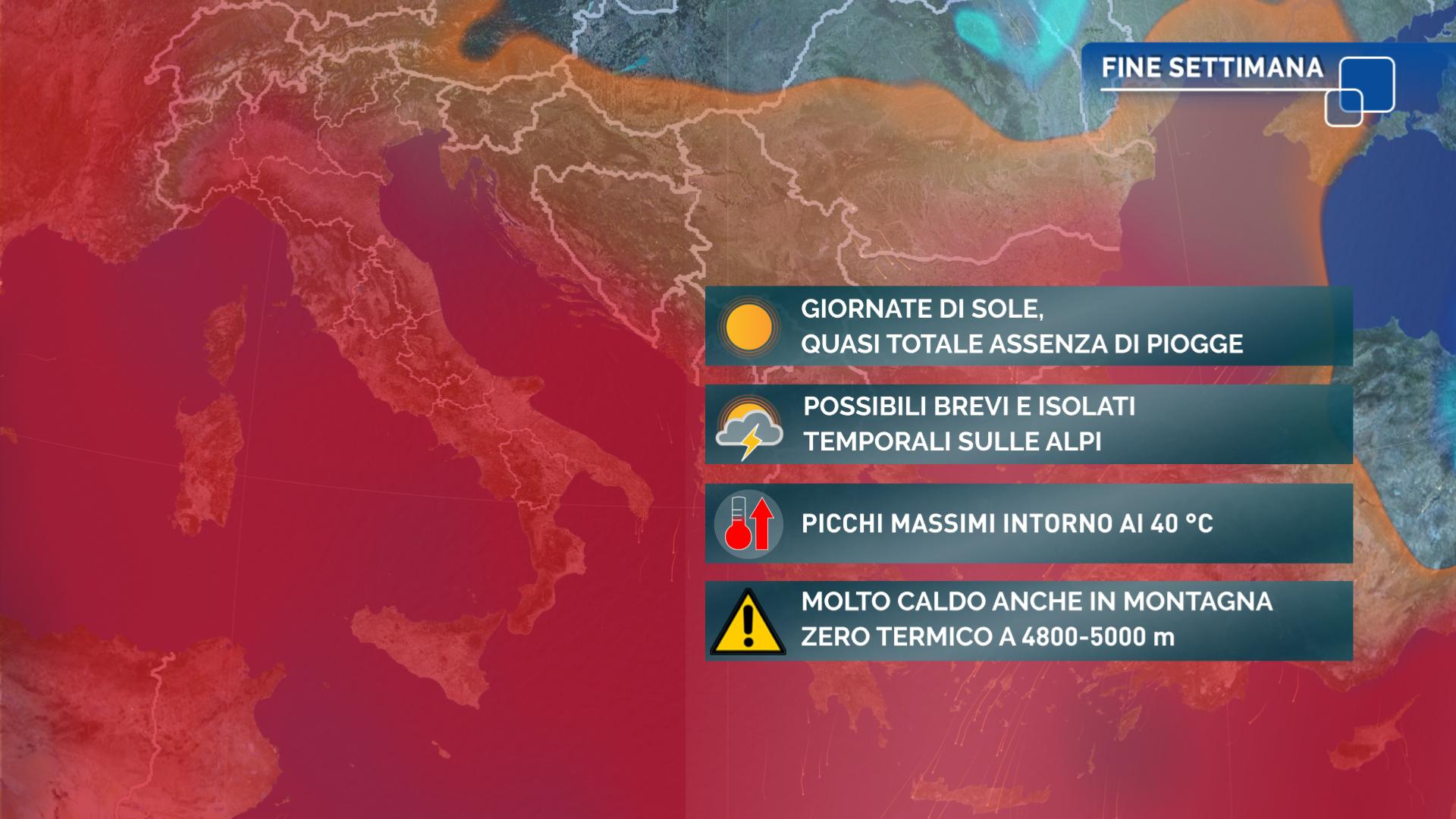 L’ondata di caldo rovente che sta interessando tutta l’Italia si trova nella sua fase acuta. Anche nel corso di questo weekend saranno possibili picchi prossimi ai 40 gradi, in particolare nella Pianura Padana e nelle aree interne del Centro-Sud. Le notti saranno via via sempre più calde, con temperature minime superiori ai 20 gradi (notti tropicali). Clima eccezionalmente caldo anche in quota, con lo zero termico che domenica si spingerà fino ai 4800-5000 metri.