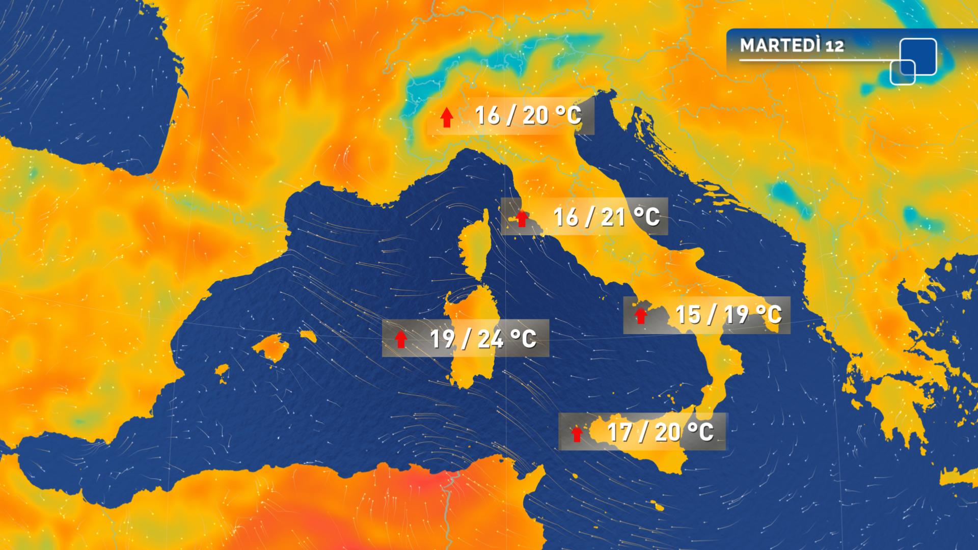 Temperature in generale aumento, con massime fra i 16 e i 22 gradi e locali punte a sfiorare i 25 sulla Sardegna occidentale. Venti: tesi di Scirocco sui mari più occidentali e nel Canale di Sicilia, particolarmente intensi intorno alla Sardegna. Mari: calmi o poco mossi Adriatico, Ionio e Tirreno sud-orientale; mossi i restanti bacini, fino a molto mossi il basso Ligure, i bacini attorno alla Sardegna e il Canale di Sicilia, anche agitato il Canale di Sardegna.