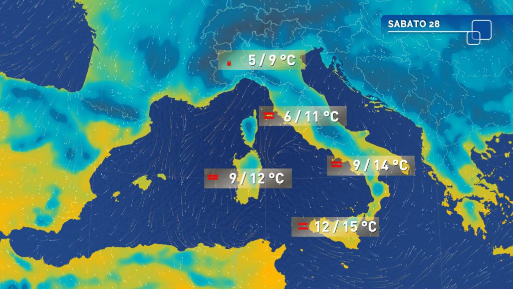 Temperature senza grandi variazioni: minime sottozero in pianura al Nord, massime ancora inferiori alla media soprattutto al Centro-Sud.