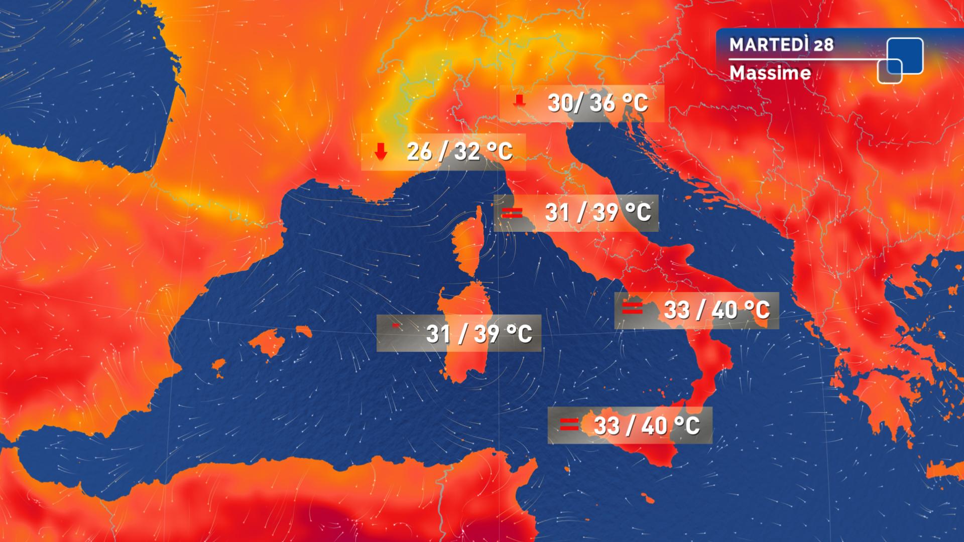 Temperature: minime quasi ovunque in lieve rialzo; massime in sensibile calo al Nord-Ovest; in calo anche su Alpi centro orientali, Emilia Romagna, Toscana e Sardegna, in aumento su estremo Sud e Sicilia ionica. Eccetto che sul Nordovest, il clima sarà ancora estremamente caldo.