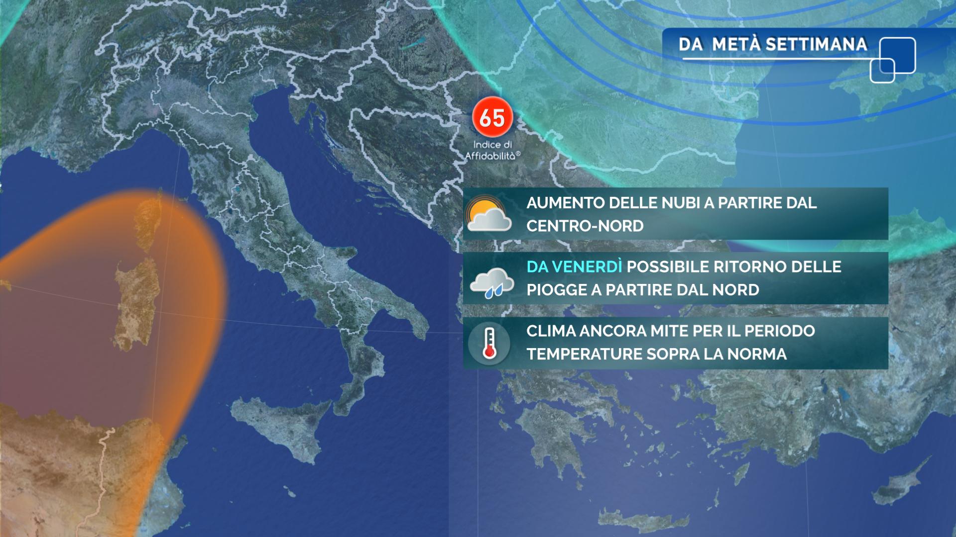 La scena meteo dell’Italia, da Nord a Sud, è dominata dall’Anticiclone nord africano che oltre ad assicurare tempo stabile e prevalenza di sole sta dando vita a un clima primaverile con picchi anche fino a 26 gradi. Ovviamente la stabilità atmosferica contribuisce alla formazione di nebbie e foschie nonché ad un peggioramento della qualità dell’aria. Da giovedì primi segnali di cambiamento con un aumento delle nuvole al Nord seguito da un ritorno delle piogge tra venerdì e sabato.