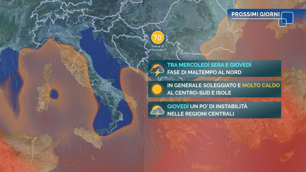 Le regioni nordoccidentali saranno invece raggiunte da una attiva perturbazione atlantica mercoledì pomeriggio con rovesci o temporali localmente anche forti. Il sistema perturbato, entro giovedì sera, dovrebbe interessare anche il Nordest e parte del Centro. Cresce la probabilità di piogge abbondanti su alcune aree del Nord (in particolare sull’alta Lombardia e al Nordest).