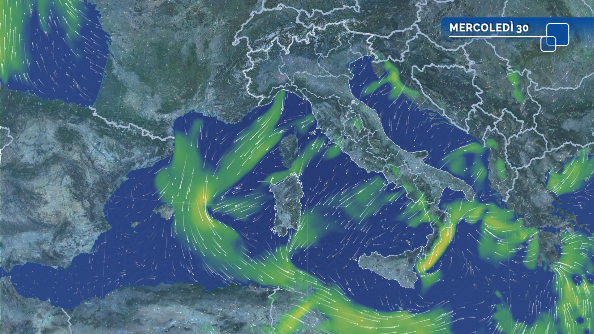 Mari: agitato lo Ionio settentrionale; molto mossi gli altri mari meridionali e intorno alla Sardegna; in generale mossi o localmente poco mossi i restanti bacini.