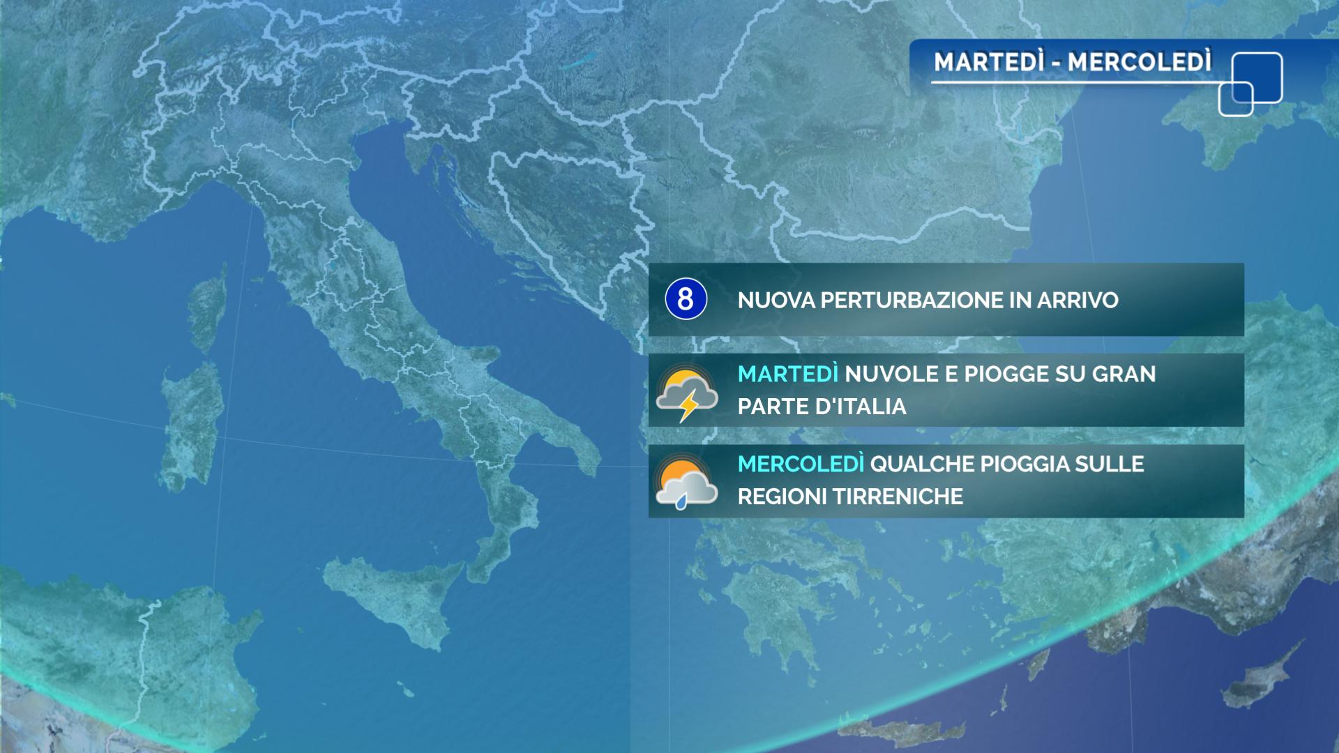 Il contesto meteo di martedì e mercoledì vede una fase più variabile sull’Italia con poche piogge, non particolarmente significative, più che altro al Nord-Est e sui settori occidentali del Paese innescati dalla perturbazione numero 8. Questo passaggio perturbato sarà inoltre caratterizzato da correnti occidentali molto intense. La giornata di mercoledì sarà più o meno simile.