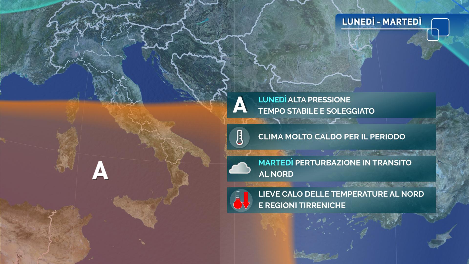 Temperature in calo al Nordovest, diminuzioni più lievi in Triveneto e Toscana, valori per lo più stazionari altrove; in generale temperature ancora sopra le medie in tutto il Paese, con le massime comprese tra 17 e 25 gradi.