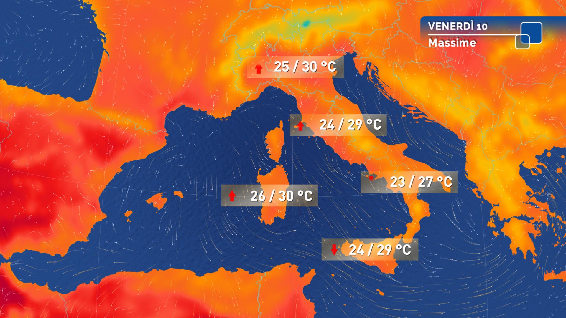 Temperature in lieve aumento; massime pomeridiane con valori compresi tra 26 e 28 gradi sulle regioni adriatiche e tra 28 e 32 gradi al Nordovest, sulle regioni tirreniche e nelle due isole maggiori.