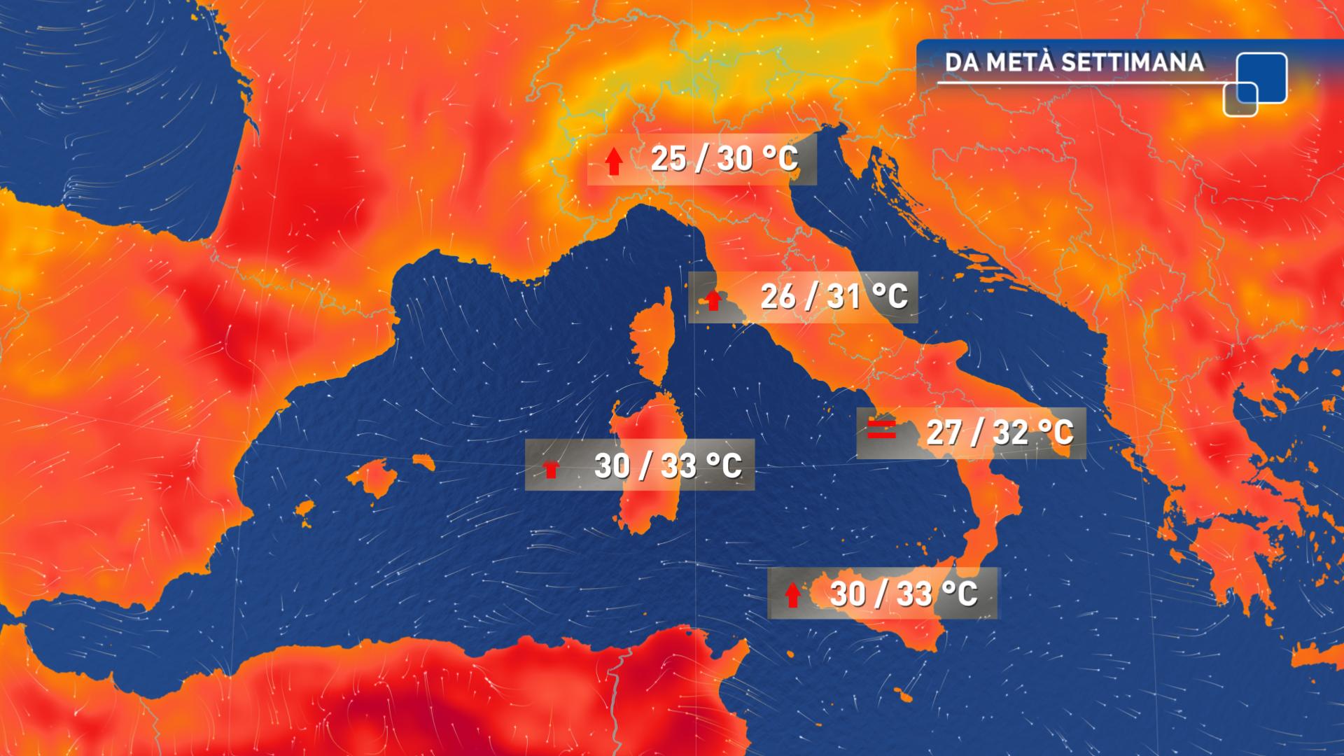 Temperature in aumento, sia nelle minime che nelle massime. Valori pomeridiani vicini alla norma al Nord, superiori alle medie stagionali al Centro e soprattutto al Sud, con punte oltre i 30 gradi su Puglia e Calabria, fino a 33-34 gradi nelle aree interne di Sardegna e Sicilia.
