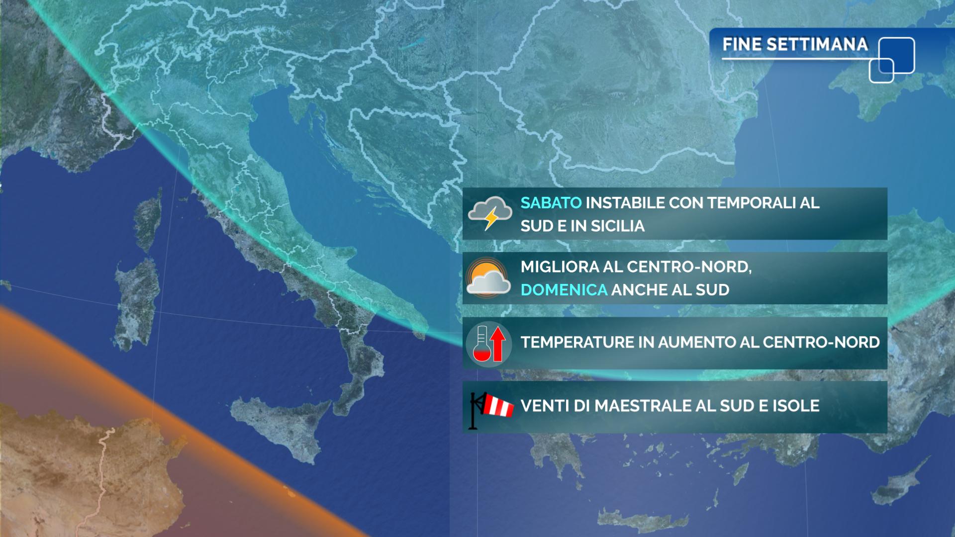 Temperature per lo più in calo al Nord e sul medio Tirreno; locali rialzi al Sud e in Sicilia dove si potranno toccare punte di 28-30 gradi.