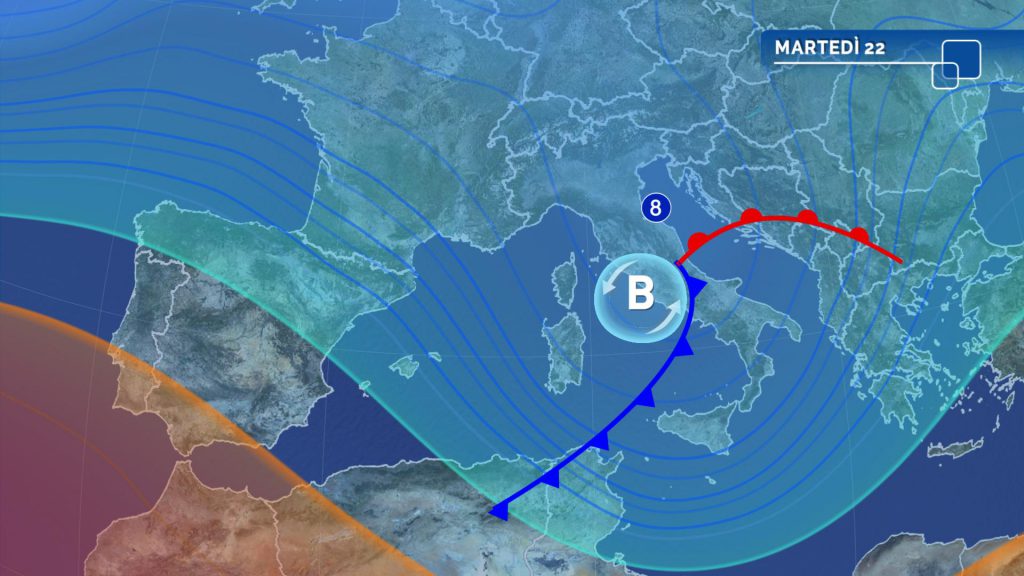 Piogge da Nord a Sud con rischio nubifragi soprattutto su Triveneto, Emilia, Liguria di Levante, Toscana, Umbria, Lazio, Campania e settori occidentali di Abruzzo e Molise. Attesi inoltre venti tempestosi con raffiche superiori ai 100 km/h, violente mareggiate con onde alte fino a 6/8 metri e neve abbondante sulle Alpi, soprattutto sul settore centro orientale con accumuli da 50 a 100 cm in 24 ore sopra i 1500 metri. Seguirà, fra mercoledì e giovedì, un miglioramento e una probabile fase più stabile, caratterizzata da correnti occidentali relativamente miti e asciutte.