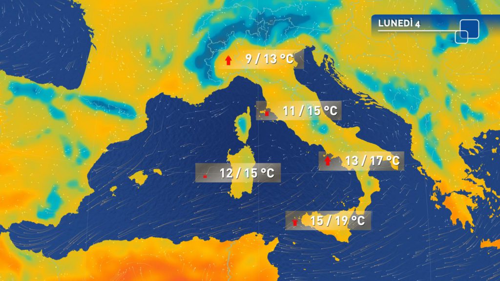 Temperature ancora inferiori alla norma; massime in leggero rialzo in Piemonte, nelle zone interne e tirreniche del Centrosud e nelle Isole maggiori. Venti in generale attenuazione: Maestrale di moderata intensità sulla Sardegna, venti ancora tesi occidentali al mattino sul basso mar Tirreno, sulla Calabria e sull’alto Ionio; venti in prevalenza deboli sulle regioni centro settentrionali. Mari: molto mossi mare di Sardegna, Tirreno centro meridionale, canali delle Isole e alto Ionio, con moto ondoso in attenuazione; da poco mossi a mossi gli altri bacini.