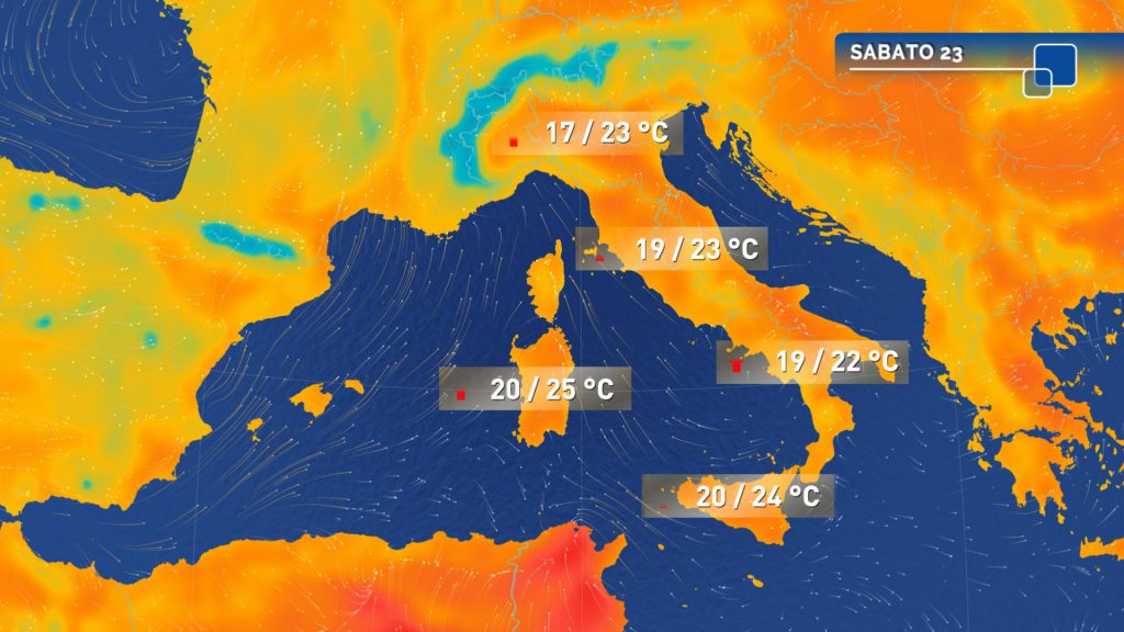 Temperature massime in rialzo al Nord e in Sardegna; locali rialzi anche in Puglia e settori ionici; in calo nel settore tirrenico dove cessa l’effetto dello Scirocco.