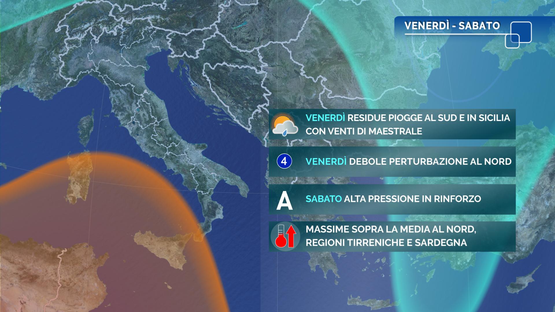 Temperature minime in rialzo al Centro-Nord; massime in lieve calo al Nord-Ovest, in aumento nella Sardegna occidentale, per lo più stazionarie altrove con valori quasi ovunque superiori alla norma, fino a 25-26 gradi al Centro-Sud, con punte superiori sulla Sardegna.