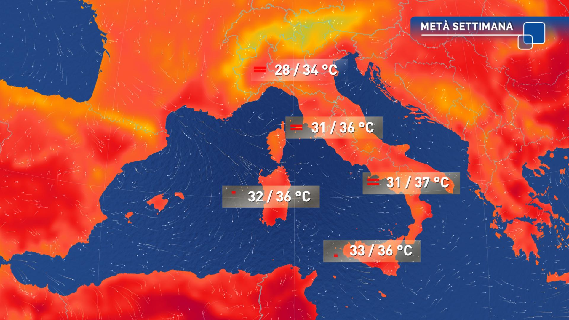 Il caldo inizierà ad attenuarsi al Nord: temperature in lieve calo anche al Centro e nell’ovest della Sardegna. Altrove valori per lo più stazionari con picchi vicini ai 40 gradi in Sicilia, Puglia, Basilicata e Calabria.