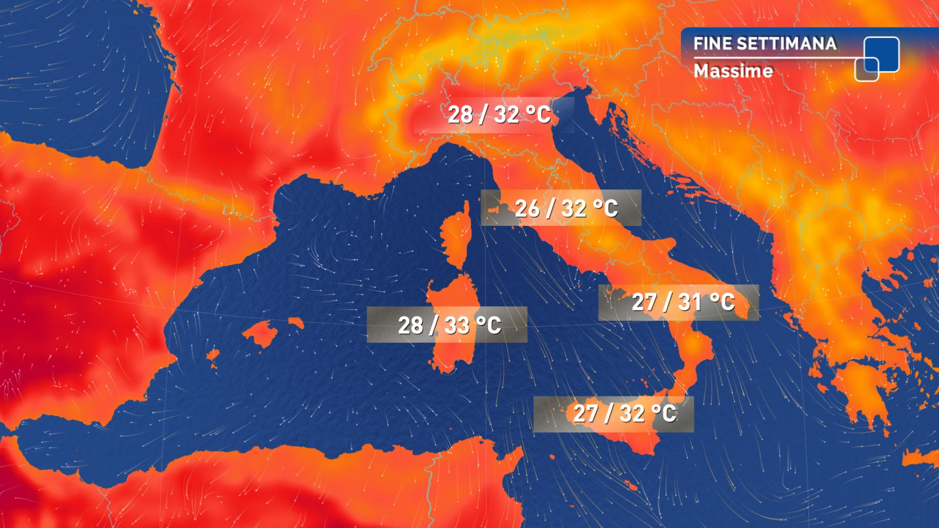 Temperature: massime in lieve calo al Nord, in leggera ripresa al Sud: valori ancora leggermente sotto la media nel settore del medio-basso Adriatico, intorno alla norma nel resto d’Italia con punte di poco oltre i 30 gradi sulla pianura Padana centro-occidentale, sulle regioni tirreniche e sulle isole.