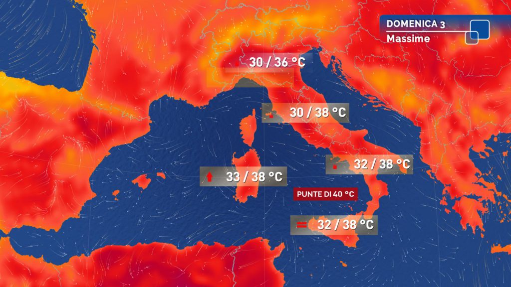 Temperature molto elevate, solo in leggero calo sulle Alpi, in Piemonte e Lombardia. Possibili punte fino a 36-38 gradi nella pianura padana orientale e al Centro-Sud, ma con locali picchi intorno ai 40 gradi nelle zone interne del Centro-Sud e Isole.