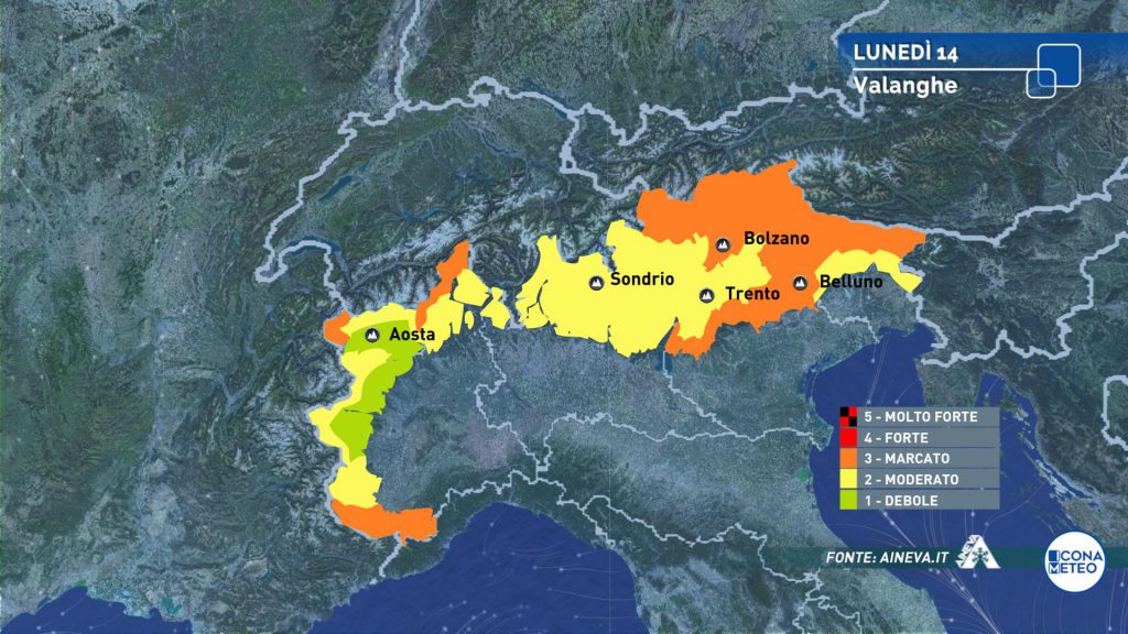 Durante le ultime intense fasi di maltempo, sulle Alpi è caduta tantissima neve, specie nel settori orientali. Il pericolo valanghe, seppur in calo, risulta ancora marcato (arancione) su diversi settori. In particolare, nella giornata di oggi, lunedì 14 dicembre, il servizio Aineva prevede un pericolo valanghe marcato sulle Alpi del Friuli, su gran parte dei settori alpini del Trentino Alto Adige, sui settori alpini di confine di Piemonte e Valle d’Aosta, e sulle Alpi Liguri e Marittime.