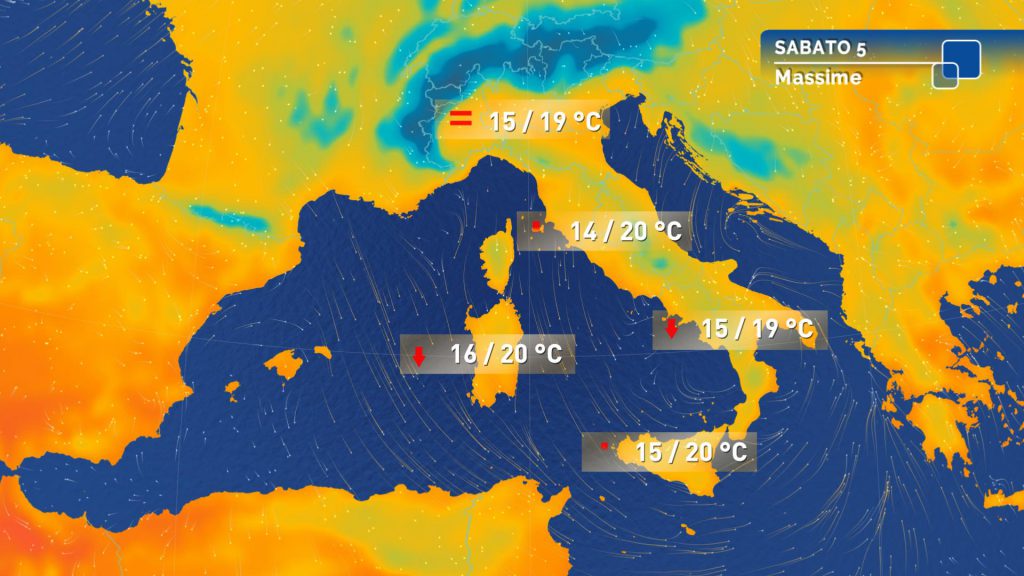 Temperature: minime in rialzo in Sardegna, in calo altrove; massime in lieve diminuzione in Val Padana, in leggero rialzo al Sud e sulle isole.