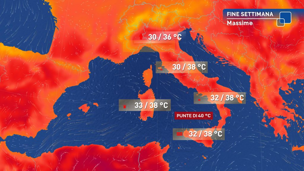 Temperature massime in lieve flessione in Sicilia e Calabria, in aumento altrove, più sensibile al Nord-Ovest; punte fino a 35-37 gradi sulla bassa Val padana; al Centro-Sud valori tra 32 e 38 gradi, con picchi fino a 39-40 gradi in Sardegna.
