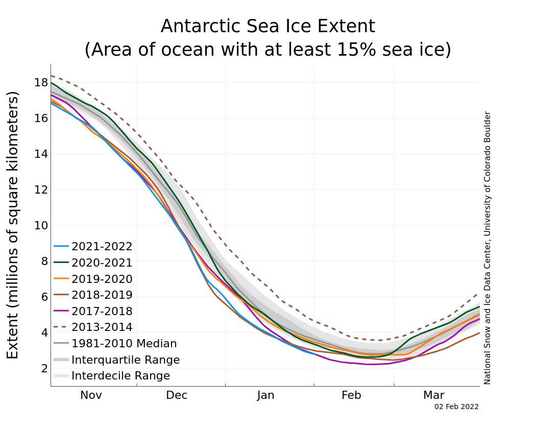 A gennaio 2022 l’estensione media è stata inferiore a quella del 2017 lungo i settori Indiani e Pacifici, ma è risultata essere superiore negli altri settori. Nel complesso, però, l’estensione è risultata essere la seconda più bassa degli ultimi 44 anni.