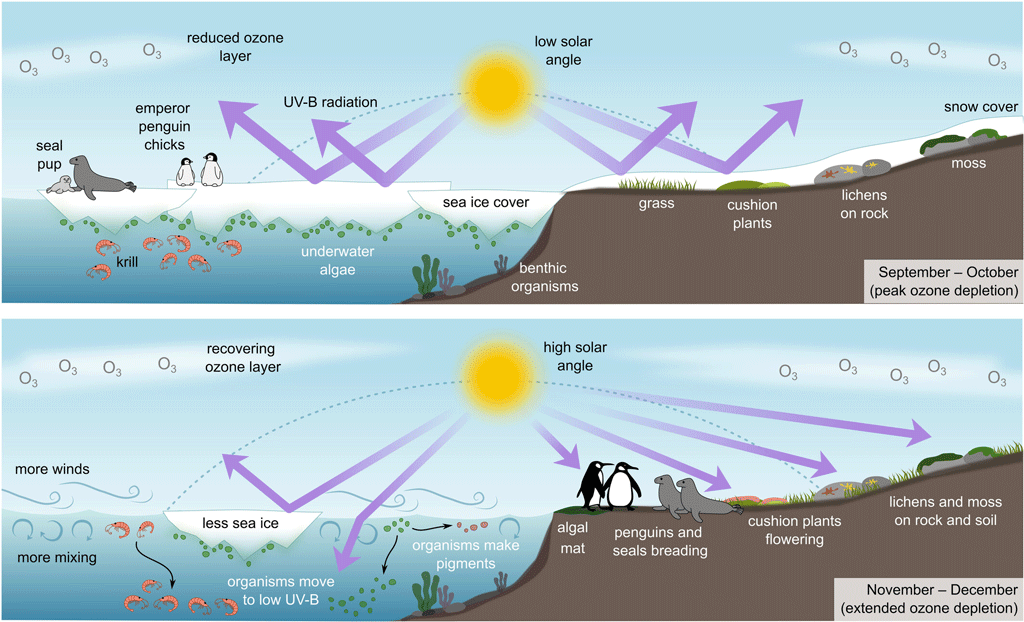 Secondo un recente studio, pubblicato sulla rivista Global Change Biology, infatti la riduzione dell’ozono stratosferico sopra l’Antartide di solito raggiunge il picco tra settembre e ottobre, quando fortunatamente la maggior parte della vegetazione terrestre e del biota del suolo antartico sono congelati, dormienti e protetti dalla copertura nevosa, e gran parte delle specie marine protette dal ghiaccio marino.