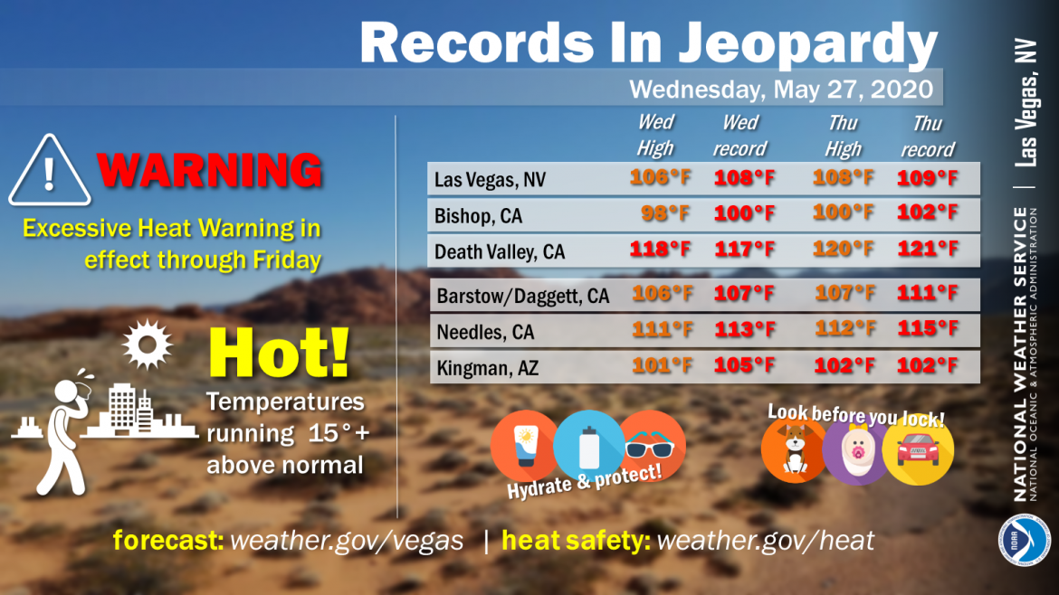 Quella di oggi potrebbe essere la giornata più calda della settimana: sono previsti valori massimi anche oltre i 40 gradi specie nella Valle di San Joaquin, in California. Anche a Las Vegas, in Nevada, tra oggi e domani sono previste temperature massime di circa 40 gradi. Si tratta di valori anomali che, a fine maggio, non si raggiungevano da quasi 20 anni: era dal 2003 che la città di Las Vegas non raggiungeva temperature così alte a fine maggio.