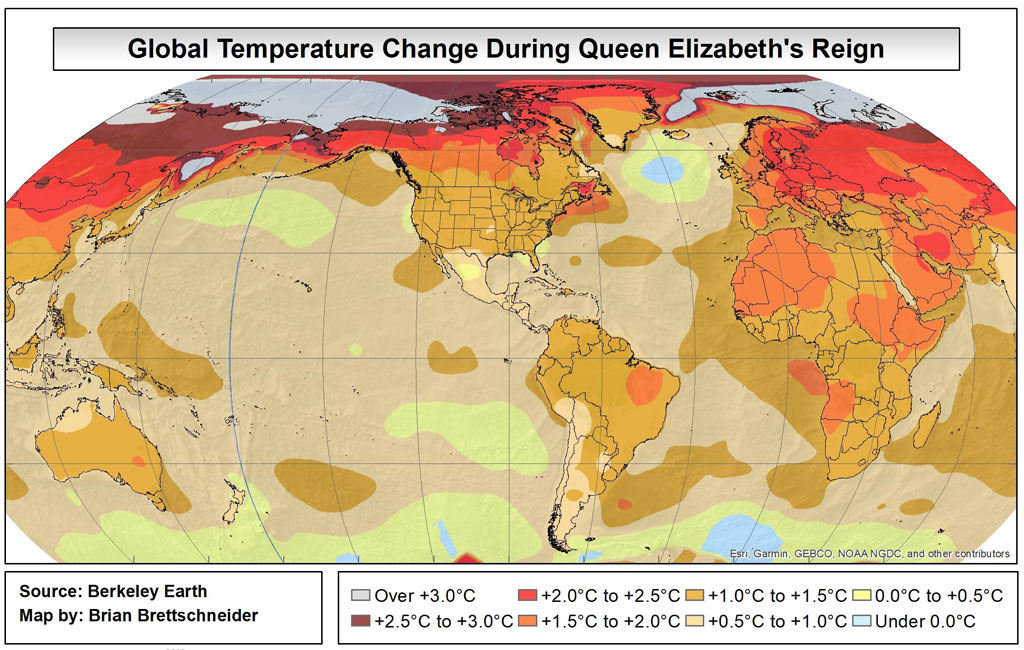 Quanto si è scaldato il Mondo durante il lungo regno di Elisabetta II?A volte capire il ritmo con cui viaggia il riscaldamento globale risulta difficile. Si parla di decenni, di secoli, ma a volte sembrano periodo lontani. Brian Brettschneider, climatologo di base in Alaska, ha realizzato, basandosi sui dati di Berkeley Earth, una mappa che mostra quanto il Mondo si sia scaldato nei 70 anni di Regno di Elisabetta II. La mappa mette subito in evidenza la regione artica, che ha subito un riscaldamento di 3 gradi. Spiccano anche le terre emerse dell’emisfero settentrionale. Rispetto a 70 anni fa, le temperature oggi sono in media da 1 a 2 gradi o più superiori. In Europa, in particolare, i settori occidentali sono da 1,5 a 2 gradi più caldi, i settori centro-orientali persino 2 o 2,5 gradi più caldi di allora. Anno dopo anno, decennio dopo decennio, ci stiamo abituando a temperature sempre più elevate. Un cambiamento che ci sembra lento, rispetto alle nostre vite, ma che in realtà avviene molto velocemente, in ogni angolo del Mondo.