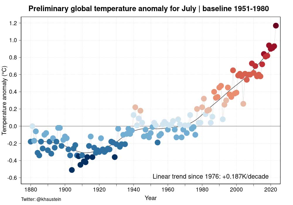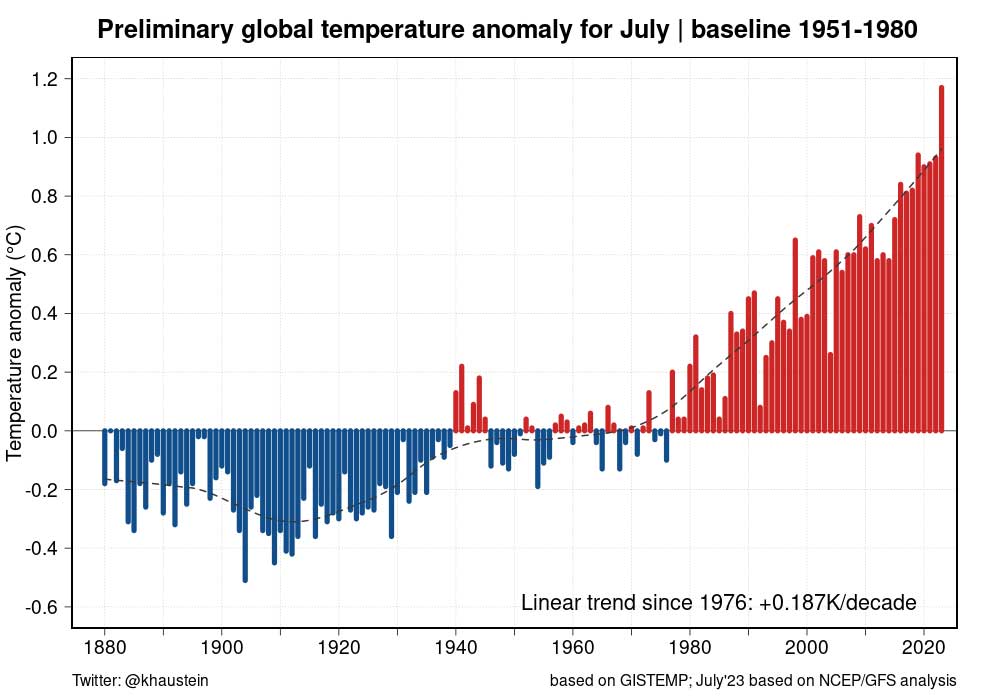 Secondo l’analisi luglio 2023 si chiuderà con una anomalia di +1,5 gradi rispetto alla temperatura media del pianeta prima che l’uomo iniziasse a bruciare carbone, petrolio e gas. Nonostante si sia raggiunta questa anomalia non significa che l’obiettivo di limitare il riscaldamento globale sotto tale soglia sia fallito: il riscaldamento medio viene infatti misurato su una scala temporale più lunga.