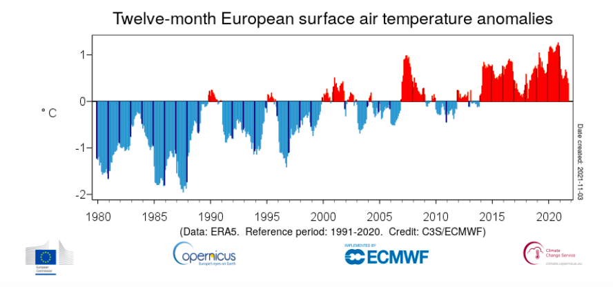 L’ottobre 2021 è stato il terzo più caldo nella storia, secondo il programma di osservazione della Terra dell’Unione Europea Copernicus, con temperature di 0,42 °C superiori alla media dal 1991 al 2020.