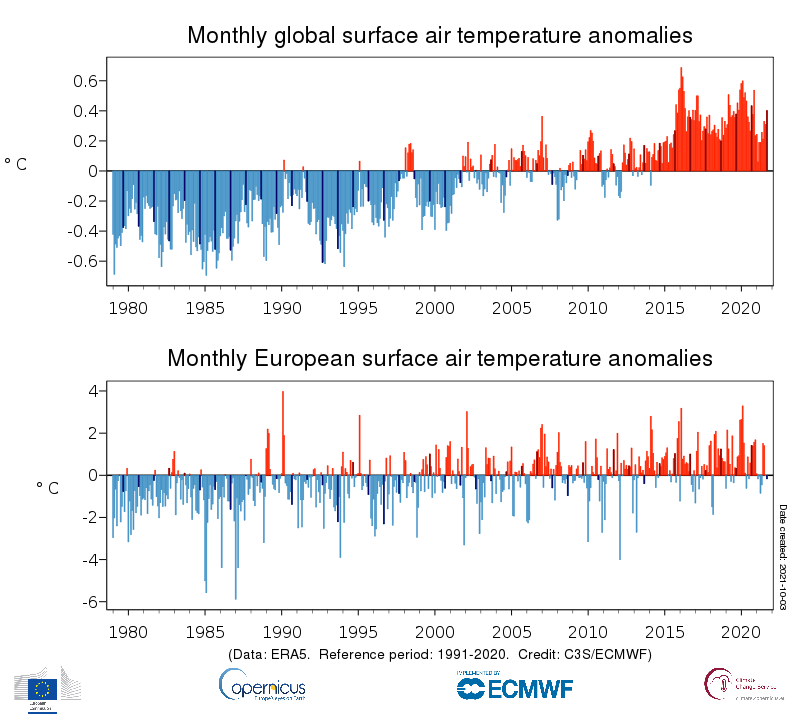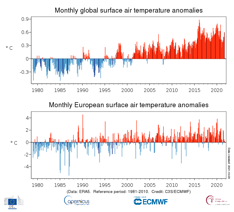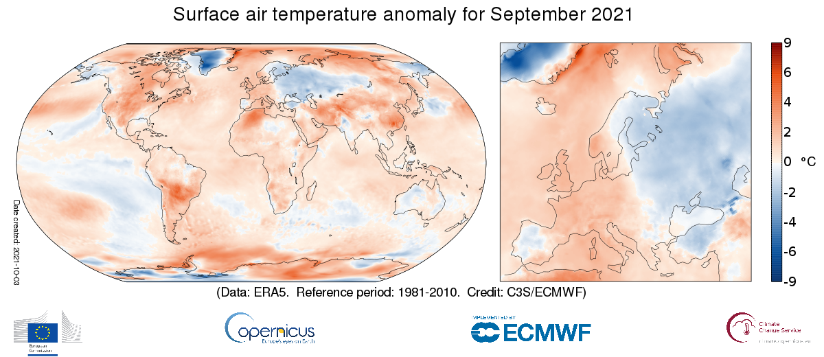 Settembre 2021 ha fatto registrare 0.40°C in più rispetto alla media 1991-2020 ed è stato stimato come il secondo più caldo, dopo quello del 2020, ma con poca differenza a livello di classifica rispetto agli altri tre settembre più caldi (che includono 2016 e 2019), vale a dire meno di 0,08°C nella temperatura media globale.