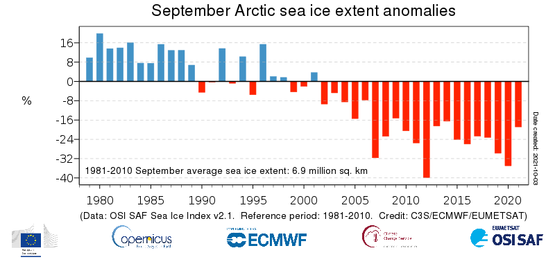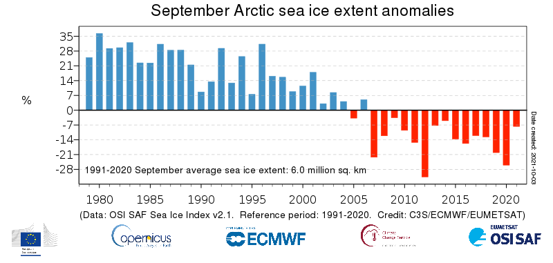Nel settembre 2021 l’estensione media mensile del ghiaccio marino ha raggiunto il suo minimo annuale nell’Artico e il suo massimo annuale nell’Antartico. L’estensione del ghiaccio marino artico era dell’8% al di sotto della media, classificandosi al 12° posto più basso nella registrazione dei dati satellitari degli ultimi 43 anni e al quarto valore più alto dal 2007, ben al di sopra delle estensioni molto basse del 2012, 2019 e 2020. L’estensione del ghiaccio marino antartico è stata leggermente al di sotto della media, dopo sei mesi consecutivi di valori superiori alla media. Le concentrazioni di ghiaccio marino erano superiori alla media intorno alla penisola antartica e nel Mare di Weddell settentrionale e inferiori alla media nei due settori oceanici adiacenti.