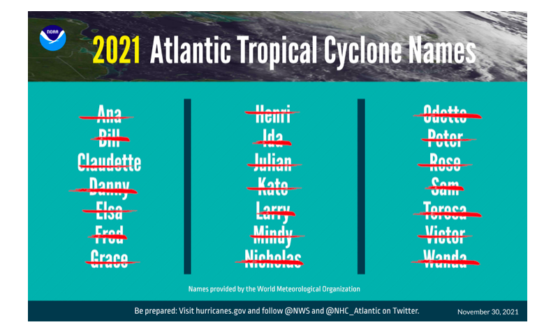 Il numero totale di tempeste tropicali della stagione in esame, 21, ha esaurito l’elenco di nomi stabilito dall’Organizzazione Mondiale della Meteorologia (WMO). Si è trattato infatti di una stagione molto attiva, la terza in assoluto per numero di tempeste tropicali (dopo quelle del 2005 e del 2020, rispettivamente con 27 e 30 tempeste), e quindi la seconda di fila che ha visto l’utilizzo di tutti i nomi a disposizione.