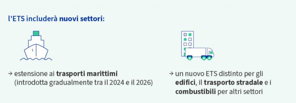 Rispetto al mercato del carbonio, il Consiglio Europeo ha accettato la decisione del Parlamento di includere anche le emissioni di gas serra del settore marittimo e di integrare in modo più concreto l’aviazione, oltre all’istituzione di un ETS separato per i trasporti su gomma e il riscaldamento domestico che sarà attivo dal 2027 ma potrebbe essere rimandato se dovessero aumentare di nuovo i costi dell’energia.