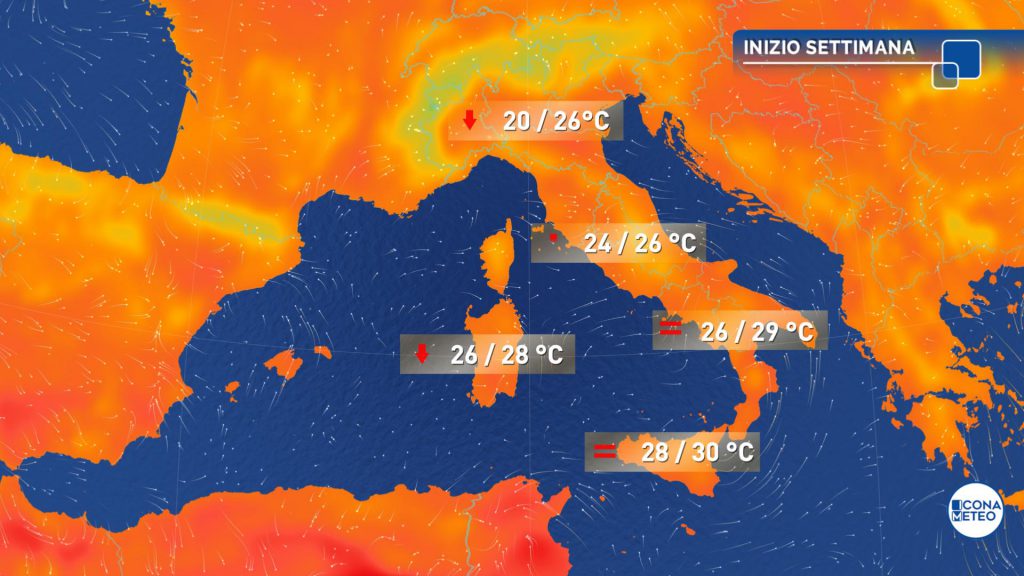 Nuvolosità anche densa al Nordovest, in Emilia e nelle regioni del versante centrale tirrenico, più variabile altrove con qualche schiarita temporaneamente ampia al Sud e in Sicilia. Nel pomeriggio l’instabilità sarà più diffusa, con rischio di rovesci o temporali soprattutto su Alpi, Piemonte, nord Appennino, Emilia, zone interne e adriatiche del Centro; fenomeni più sporadici su coste liguri, pianura lombarda, Veneto, Campania, nord della Puglia, nordest della Sardegna e monti della Sicilia. Temporanea attenuazione dei fenomeni lungo le coste toscane e laziali dove diverranno poi più intensi e diffusi tra sera e notte. Temperature massime per lo più in lieve calo, eccetto all’estremo Sud e in Sicilia; al Centro-Nord valori non oltre i 24-26 gradi, al Sud e in Sicilia punte vicine ai 30 gradi.