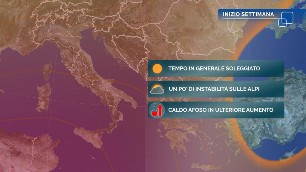 Temperature massime quasi ovunque in aumento, eccetto sullo Ionio; al Nord valori compresi tra 28 e 34 gradi, tra 30 e 38 al Centro-Sud, con picchi fino a 40 gradi sulle Isole. Venti deboli a regime di brezza, salvo locali rinforzi da est o sud-est intorno alla Sardegna e nel Canale di Sicilia. Mari: localmente mossi il Ligure occidentale, i bacini attorno alla Sardegna e il Canale di Sicilia; calmi o poco mossi gli altri.