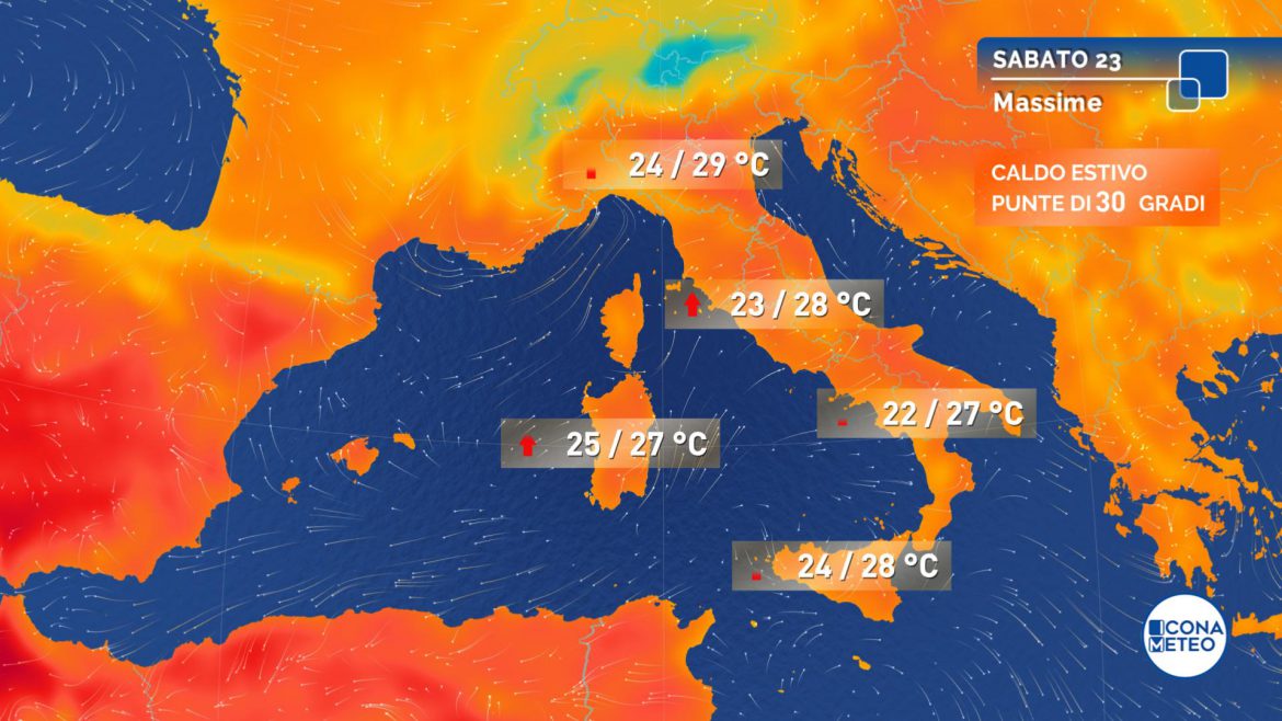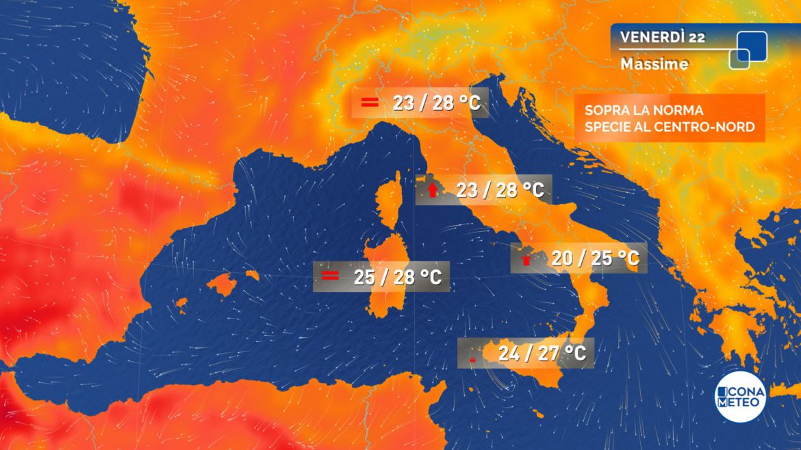 Temperature senza grandi variazioni, vicine alle medie al Sud e al di sopra nel resto d’Italia: i valori pomeridiani oscilleranno tra i 22 e 27 gradi, ma con locali punte di 28-29 gradi al Nord, in Toscana, Lazio e Sardegna.