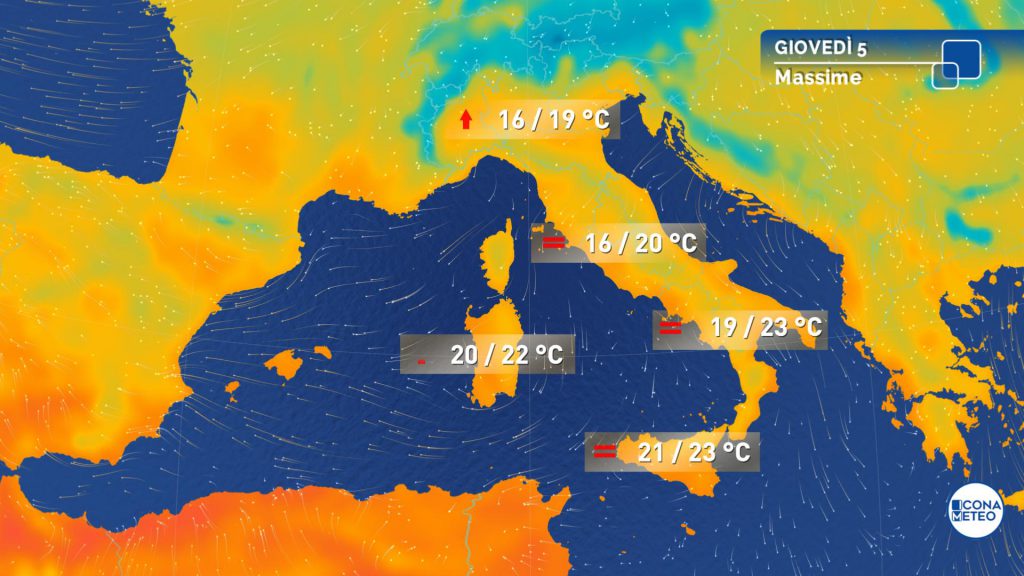 Temperature ancora sopra la media; massime comprese fra 15 e 20 gradi al Centro-Nord, fino a 21-23 gradi al Sud e sulle Isole. Venti in rinforzo da nord o nord-est su versante adriatico, Liguria, Toscana, Umbria e alto Ionio, da est intorno alla Sardegna. Mari: da poco mossi a localmente mossi Adriatico, alto Ionio, Ligure occidentale, Mare e Canale di Sardegna; calmi o poco mossi gli altri bacini.