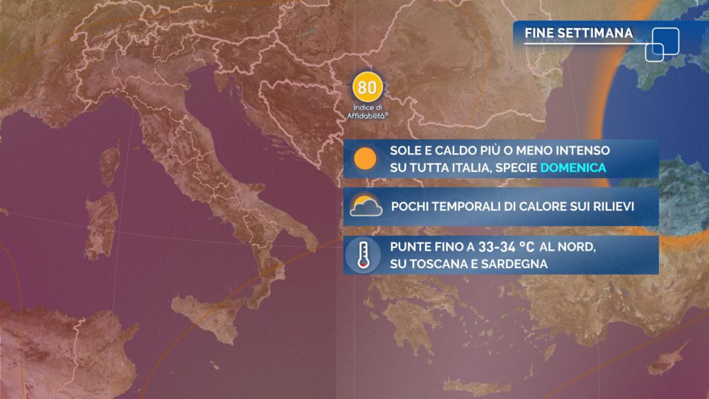Nella parte finale della settimana – infatti – l’alta pressione tenderà a estendersi e rafforzarsi maggiormente verso l’Europa centrale e le nostre regioni centro-settentrionali dove, oltre a un aumento della stabilità atmosferica, si verificherà una ulteriore intensificazione del caldo e dell’afa. I maggiori scostamenti dalla norma si osserveranno ancora una volta sui settori occidentali del Paese dove si raggiungeranno picchi di 33-35 gradi e localmente anche più elevati, specie nelle regioni centrali tirreniche e in Sardegna.