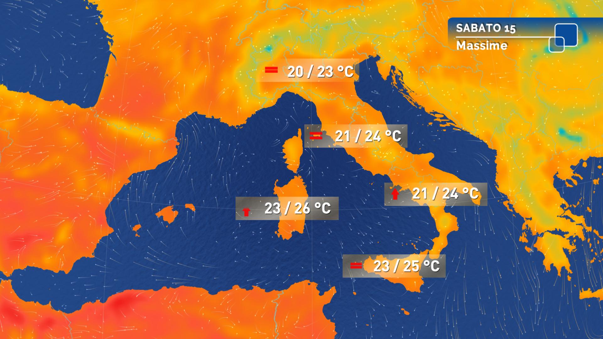 Sabato 15 al Nord e sull’alta Toscana cielo irregolarmente nuvoloso, con zone di sereno più ampie nelle Alpi occidentali e in Emilia Romagna. Nel resto del Paese tempo in prevalenza soleggiato, salvo residui annuvolamenti a inizio giornata su ovest Sardegna, Sicilia settentrionale e Puglia centrale. Temperature massime in rialzo sul medio Adriatico, al Sud e in Sicilia, senza grandi variazioni altrove. Valori sempre molto miti e superiori alla norma, in generale compresi tra 20 e 26 gradi, localmente anche oltre sulla Sardegna. Venti: moderati settentrionali su Canale d’Otranto e mar Ionio, in indebolimento nel resto del Centro-Sud.