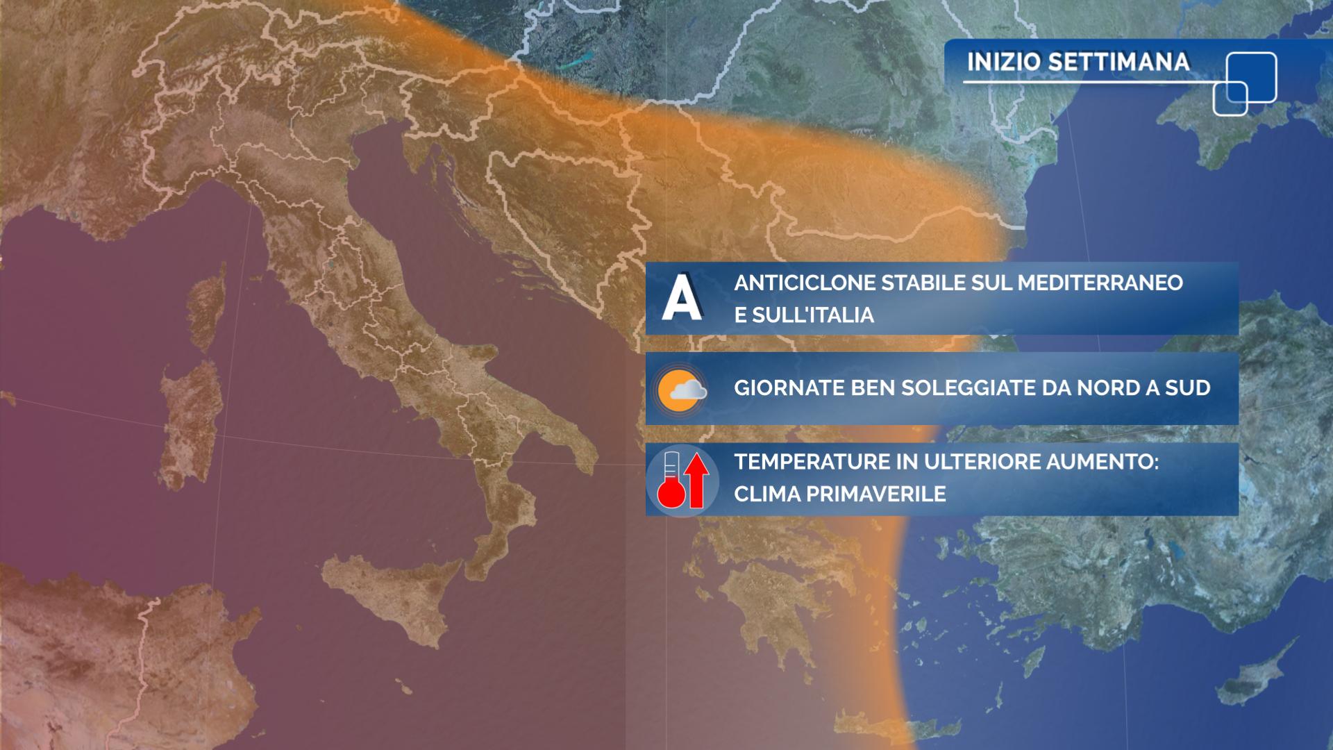 Lunedì giornata prevalentemente soleggiata su gran parte d’Italia. Nuvole anche consistenti potranno interessare solo l’ovest e il nord del Piemonte; qualche temporaneo annuvolamento sparso anche nel Cagliaritano e a ridosso dei monti della Sicilia. Per il resto cielo sereno o poco nuvoloso ma con possibili nebbie all’alba e in successivo diradamento in mattinata su Veneto, sudest della Lombardia ed Emilia. Temperature senza grandi variazioni con lievi aumenti possibili al Nord e sul medio Tirreno; clima sempre mite per la stagione con valori diffusamente compresi tra 20 e punte di 25-26 gradi. Venti moderati orientali nel Canale di Sardegna che sarà mosso. Altrove venti deboli e mari calmi o poco mossi.