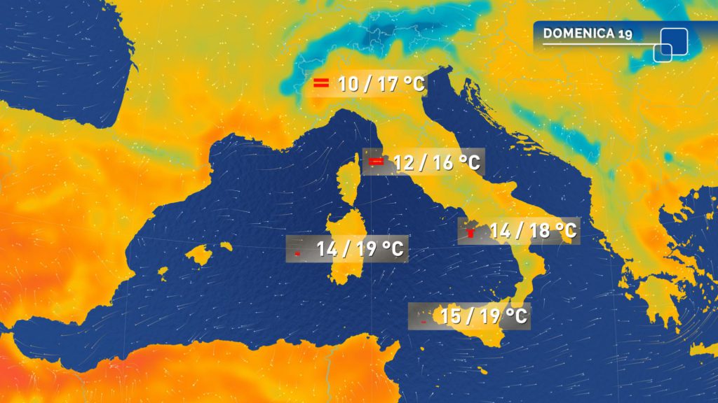 Domenica 19 cielo sereno o poco nuvoloso sulle Alpi centro-occidentali, lungo il medio-basso versante Adriatico, all’estremo Sud e sulle isole maggiori; in giornata tendenza a schiarite anche nelle pianure del Nordovest. Nel resto del Paese cielo nuvoloso per la presenza di strati bassi anche compatti, accompagnati da locali deboli piogge o pioviggini fra Liguria centro-orientale e alta Toscana e in Campania.