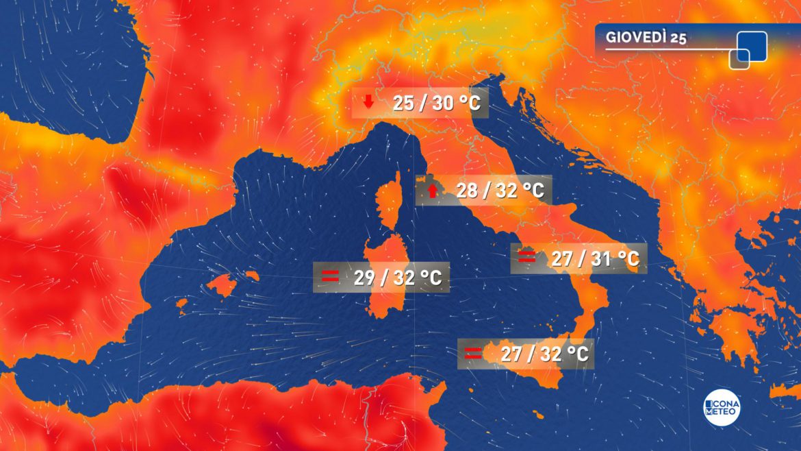 Temperature massime: stazionarie o in leggero calo al Nordovest, stabili o in lieve aumento nel resto del Paese con punte fino a 32-33 gradi al Centro-sud, localmente anche superiori su Sicilia e Sardegna. Venti: moderati o tesi di Scirocco o da Est nei Canali di Sicilia e Sardegna; deboli o a regime di brezza altrove. Raffiche nelle aree temporalesche del Nord.