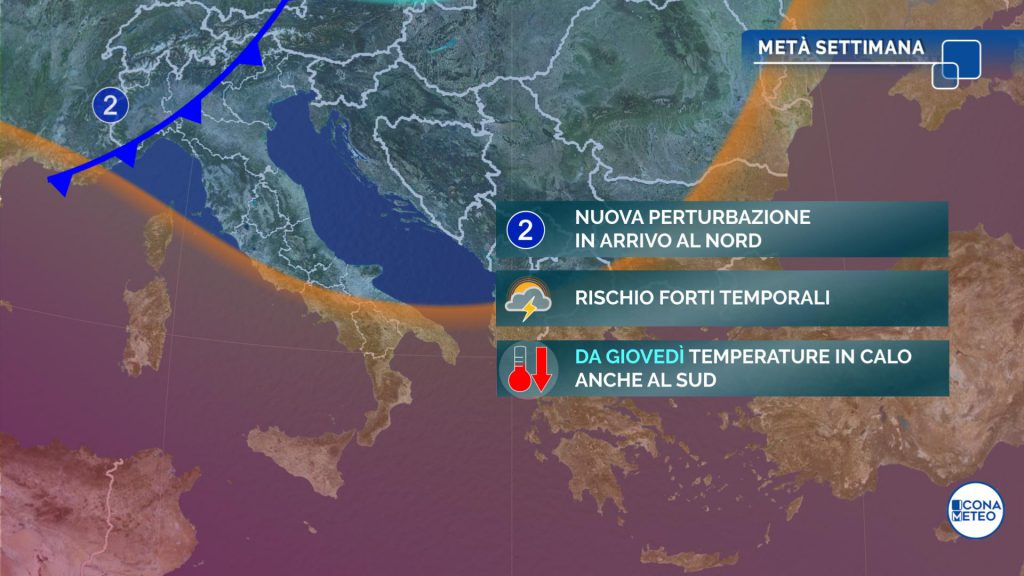 La fase instabile che interesserà il Nord a metà settimana tenderà ad attenuarsi a partire dalla giornata di giovedì. Per le regioni del Sud, invece, da giorni soffocate dalla rovente massa d’aria di origine nord-africana, da giovedì si concluderà l’intensa terza ondata di calore dell’estate, con il ritorno a temperature più in linea con la norma.