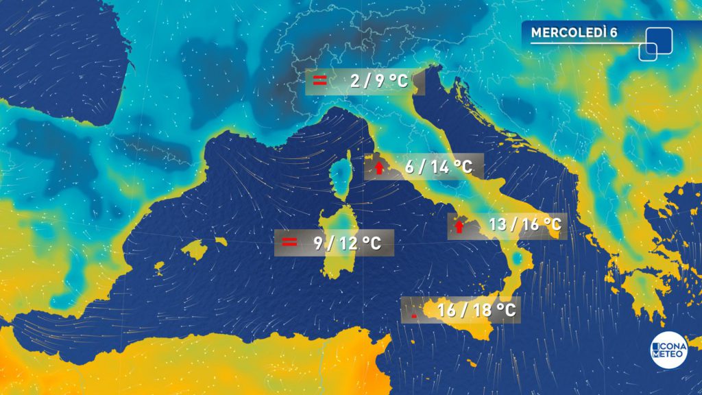 Temperature in rialzo al Sud; clima ancora invernale al Centro-Nord e Sardegna. Venti moderati o tesi di Libeccio al Sud e in Sicilia, specie sullo Ionio; rinforzi dai quadranti occidentali anche al Centro, in Sardegna e sul basso Ligure. Mari: in prevalenza poco mosso l’Adriatico sotto costa, mossi gli altri bacini, fino a molto mossi il Ligure, l’alto Tirreno, l’alto Ionio e il Canale d’Otranto.