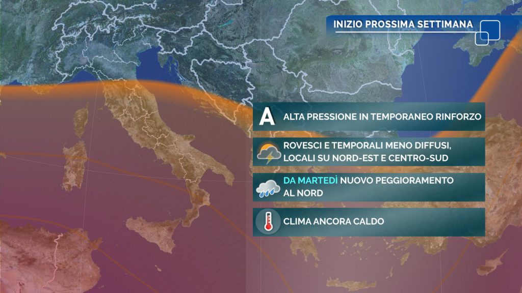 Oggi sarà una giornata caratterizzata da un elevato rischio di temporali: sul nostro Paese continueranno infatti a scorrere correnti occidentali in quota, umide e particolarmente instabili; attenzione, localmente i fenomeni potranno essere di forte intensità con rischio di grandine e raffiche di vento. Il clima resta estivo, anche se durante i temporali le temperature potranno subire bruschi e sensibili cali. Lunedì – affermano i meteorologi Meteo Expert – l’instabilità tenderà ad attenuarsi grazie ad un parziale aumento della pressione atmosferica: al Nord i fenomeni saranno pochi e limitati alle aree montuose; al Centro-Sud i rovesci e temporali saranno più numerosi, ma meno diffusi e insistenti rispetto al fine settimana, con interessamento preferenziale delle aree interne e appenniniche. Martedì un più deciso aumento della pressione atmosferica favorirà un ulteriore miglioramento al Centro-Sud mentre il Nord potrebbe essere raggiunto da una nuova perturbazione di origine atlantica (la n. 7).