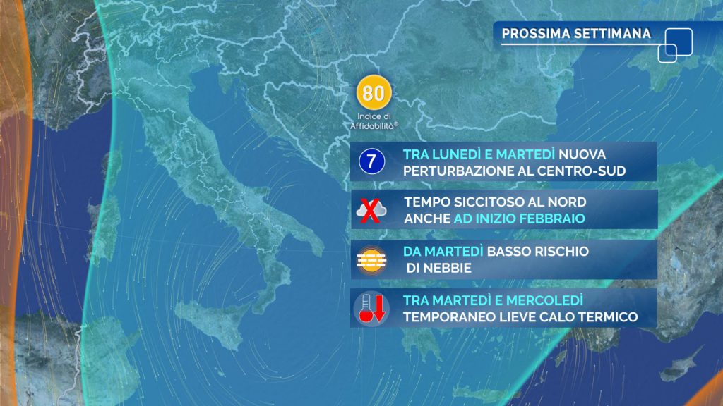 Lunedì 31 gennaio una nuova perturbazione raggiungerà l’Italia, dando vita ad una nuova fase di maltempo: il fronte freddo ad essa associato attraverserà la Penisola nel corso della notte successiva e martedì 1 febbraio darà vita a piogge, venti forti e nevicate a quote progressivamente più basse. Interessate dal peggioramento saranno, ancora una volta, le regioni del Centro-Sud, mentre per gran parte del Nord continuerà il lungo periodo di siccità.