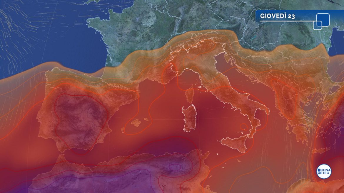 Temperature massime solo in lieve calo al Nord, e comunque fino a 32-33 gradi in pianura; stazionarie o in ulteriore lieve aumento altrove con locali picchi fino a 34-36 gradi nelle zone interne del Centro-Sud e Isole. Venti per lo più di debole intensità e a prevalente regime di brezza, con locali rinforzi da ovest o nord-ovest sul medio Tirreno e al Sud. Mari in generale calmi o poco mossi.