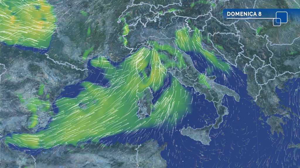 Domenica 8 avremo schiarite sul medio-basso Adriatico, versante ionico e sud della Sicilia. Nuvole altrove, più compatte al Nord, regioni centrali tirreniche, Campania e Sardegna. Al mattino piogge sparse al Nord-Ovest e alta Toscana, localmente anche moderate nel Levante ligure e in Lombardia; quota neve intorno a 1200-1400 metri sulle Alpi; qualche pioggia isolata anche lungo le coste della Venezie, nel Grossetano e nello Stretto di Messine; nebbie in dissolvimento sulla Puglia meridionale.