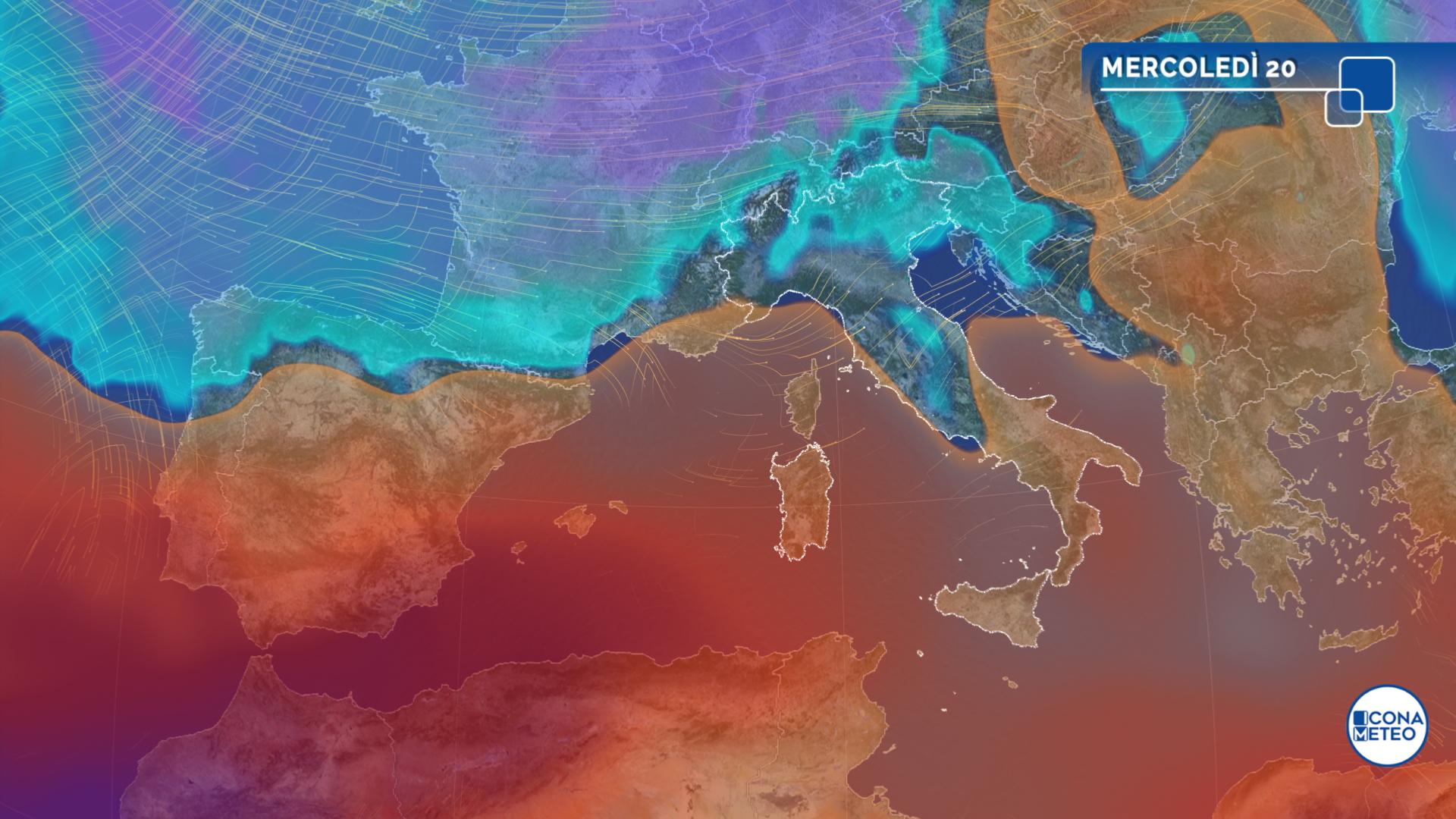 Mercoledì osserveremo i primi segnali di cambiamento con un graduale aumento delle nuvole in gran parte del Nord e in Toscana, con nubi compatte specialmente nel settore ligure, al Nord-Ovest, a ridosso delle Prealpi orientali e in Friuli. Le prime brevi piogge deboli o pioviggini saranno possibili dal mattino in Liguria, nella seconda parte della giornata anche su alto Piemonte, nord-ovest della Lombardia e rilievi friulani. Nel resto dell’Italia sarà una giornata prevalentemente soleggiata, con pochi annuvolamenti lungo il Tirreno e nelle Isole.