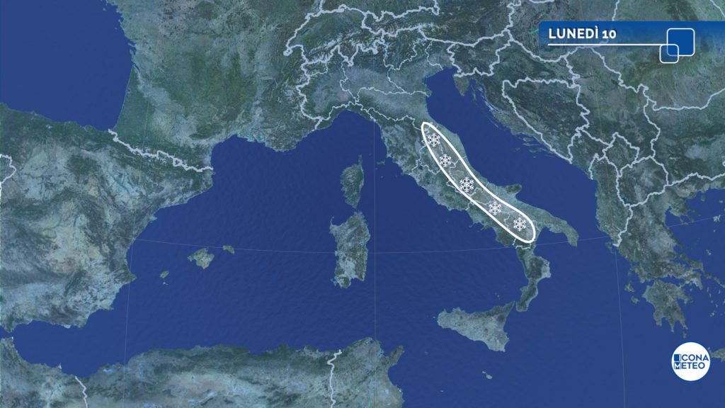 Lunedì il vortice ciclonico, posizionato sulle regioni meridionali, porterà una fase di maltempo a tratti intenso in molte zone del Centro-Sud. Particolarmente interessate dal peggioramento sono le regioni centrali Adriatiche, il Sud e la Sicilia, dove sono attese piogge a tratti intense, nevicate abbondanti e venti molto forti. La neve cadrà fino a circa 500 metri sull’Appennino centrale, specie sul lato adriatico, e a quote superiori al Sud e in Sicilia. Sull’Appennino centrale potrebbero verificarsi delle vere e proprie bufere di neve a causa dei forti venti, che soffieranno con raffiche di burrasca, a 80-100 km/h. In tutto sono attesi accumuli di 30-50 centimetri di neve nell’arco di 24 ore. Su estremo Sud e Sicilia saranno possibili anche rovesci e temporali.