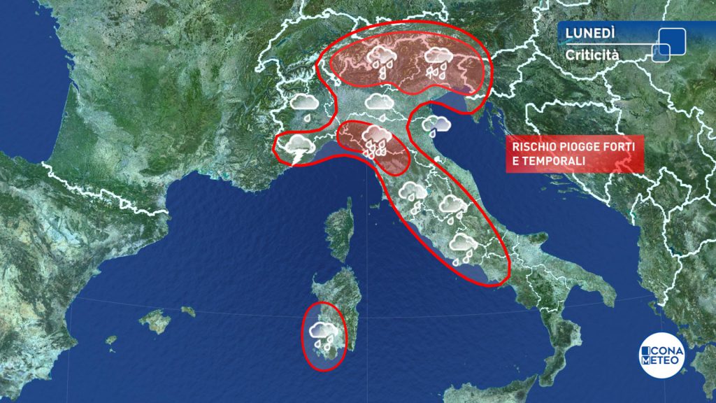La giornata di lunedì sarà molto nuvolosa su gran parte d’Italia, salvo parziali schiarite al mattino all’estremo Sud e medio versante adriatico, ma con nubi in progressivo aumento dal pomeriggio e qualche pioggia a partire dalla sera, in particolare su Campania e ovest della Sicilia. La pioggia interesserà già dal mattino le regioni di Nord-Ovest, con rischio di forti precipitazioni tra Liguria e ovest della Lombardia e possibili rovesci nel Ponente ligure. Prime piogge isolate al mattino anche all’estremo Nord-Est e in Sardegna. In questa fase la neve cadrà sulle zone alpine oltre i 900-1200 metri.